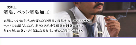 せっかくお洗濯したのにいやな臭いが・・・。 お食事会でタバコや焼肉の煙等が染み付いた、またはお洗濯しても臭いが取れなかったなど、そのような時は消臭加工をご利用ください。